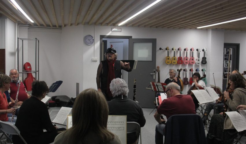 Un cop a dins la imatge sorprèn. Una trentena de persones envolten el director amb instruments a les mans i il·lusió als ulls. El mestre d’orquestra, Lluís Solé Salas, gesticula amb energia i empatia. Amb els braços marca el compàs, però amb el somriure dirigeix tot un projecte de vida: que la música soni i que, com ell diu, “es reconegui la cançó que s’està tocant”.